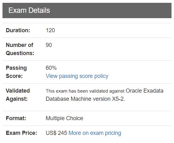 The Exam contains 90 questions related to Exadata X5 and X6. To earn this certification you need to get 60% marks.