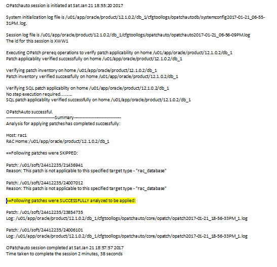 export ORACLE_HOME=/u01/app/oracle/product/12.1.0.2/db_1 export PATH=$ORACLE_HOME/OPatch:$ORACLE_HOME/bin:$PATH opatchauto apply /u01/soft/24412235 -analyze -oh /u01/app/oracle/product/12.1.0.2/db_1 Note:The opatchauto utility must be run as root.